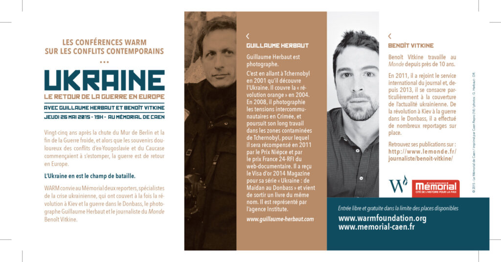 Vingt-cinq ans après la chute du Mur de Berlin et la fin de la Guerre Froide, et alors que les souvenirs douloureux des conflits d’ex-Yougoslavie et du Caucase commençaient à s’estomper, la guerre est de retour en Europe. L’Ukraine en est le champ de bataille. WARM convie au Mémorial de Caen deux reporters spécialistes de la crise ukrainienne, qui ont couvert à la fois la révolution à Kiev et la guerre dans le Donbass, le photographe Guillaume Herbaut et le journaliste du Monde Benoît Vitkine.