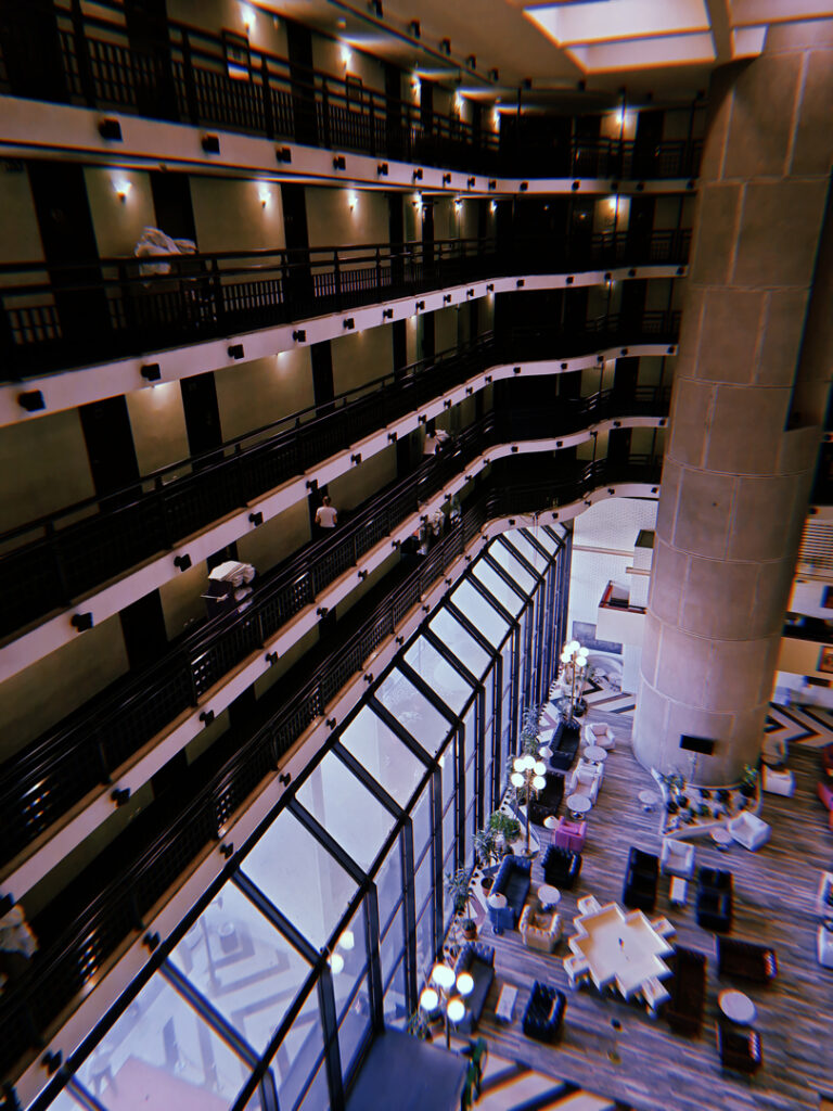 The hotel was opened in the 80s before the Sarajevo Olympic Games. I go inside and see the concentrical corridors of rooms around the giant lobby. “Foucault’s Panopticon,” I think. I think that I don’t like when people can see who enters my room and when they leave. Yet here everything is in full view. Damn Yugoslavian communists with a culture of surveillance.