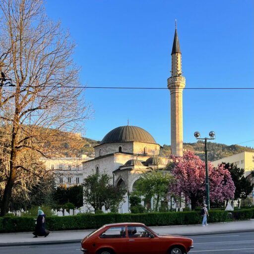When I first arrived in Sarajevo, I’d seen a cherry tree by the Ali Pasha mosque that looked like a white and pink cloud. At the same time, Kyiv had burst out with cherry, apricot, and magnolia blossoms, which I saw everywhere on social media. On the night before I departed, the last petals were gone, taken by the wind around the small cemetery next to the mosque. The first green leaves had appeared on the cherry tree, though the surrounding mountains were still waiting, rocky and bare. But time moves so fast and brings such ultimate changes that, by the time I landed in London–where I had taken my toddler daughter from Ukraine in 2022 to keep her safe–the mountains were probably already all turning green, too.
