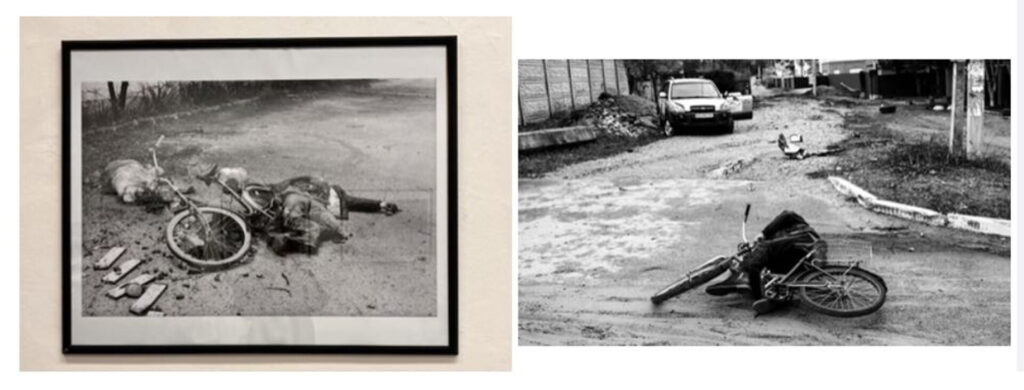 On my first evening in Sarajevo, I went to see the opening of the exhibition “Sarajevo: grad ljubavi i stradanja” (Sarajevo: the city of love and suffering), and already one of the first photos made me feel as if I’d seen it before. It was an image of a bicycle and a dead old civilian shot while crossing the village. After liberating the town of Bucha near Kyiv in the spring of 2022, someone had taken the same photo, and for a while, it was everywhere on the internet: a man, a bicycle, a death.