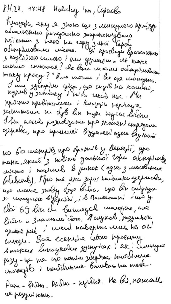 We met an old man sitting on a tree stump, smoking in the shade, as if waiting for us. We greeted him, and Claudia hesitantly asked if he had been here during the war. He began telling us about the trees mowed down by shells, the trenches 50 meters apart, his brothers in Venice, a tank shelling the city from an even farther mountain, and hitting the market (one of the massacres). He spoke about current state policy, the possibility of another war, his interest in the situations in Ukraine and Palestine, and how, at 69, he would look younger if the war hadn’t “broken him.”