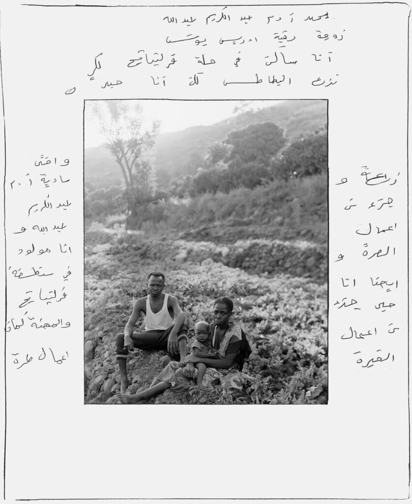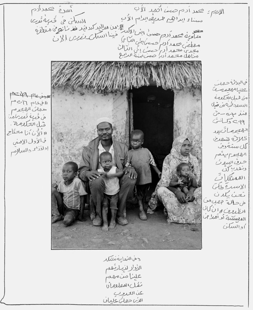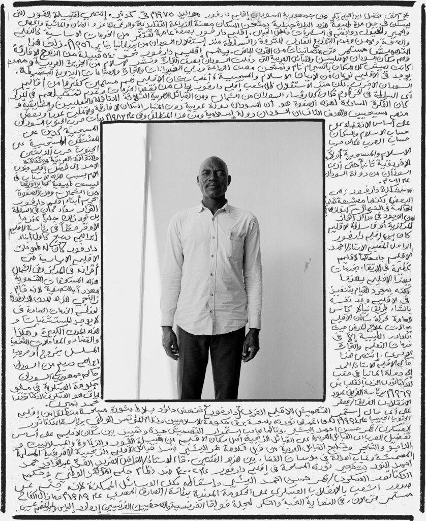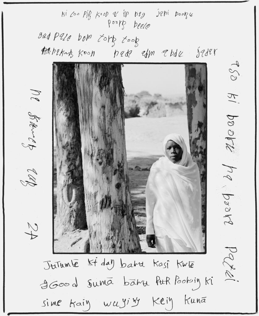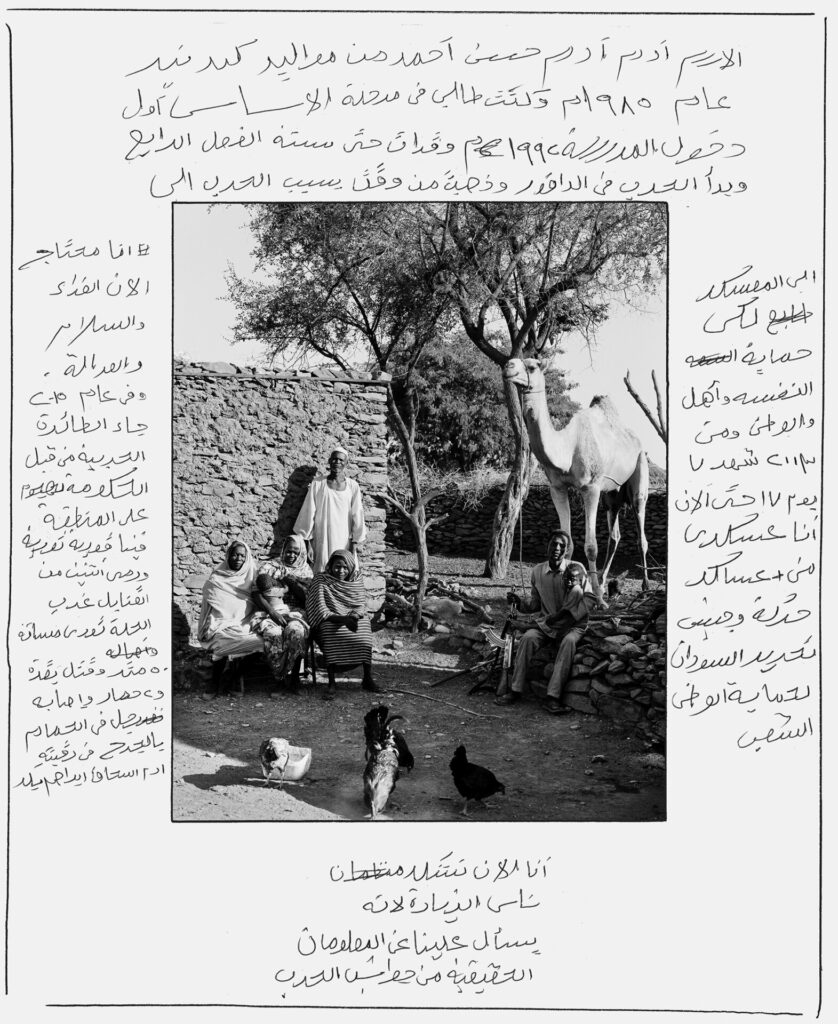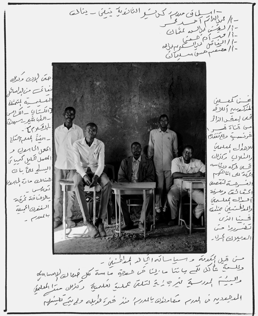 Most of them wrote in Arabic, others in Fur dialect, and some, who could not write, dictated what they wished to convey. These texts are an integral part of the images, encompassing it. Thus, their words are whole and reproduced in their entirety. This method was designed to give them the opportunity to describe through their own eyes their self-image. Indeed, the photographer’s function is not only to freeze an image, to take it from those posing. The idea was to give a role to those accepting to go in front of the lens. They are then no longer subjects but players in their own photograph.