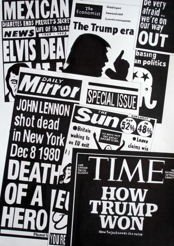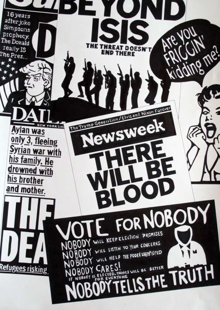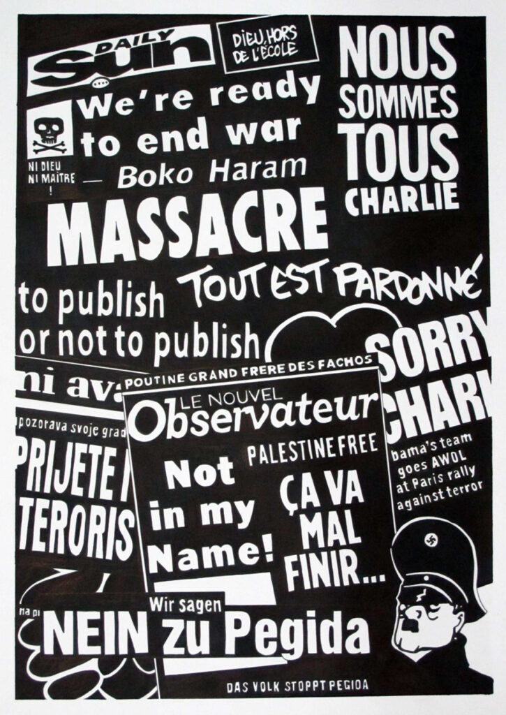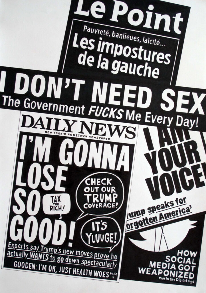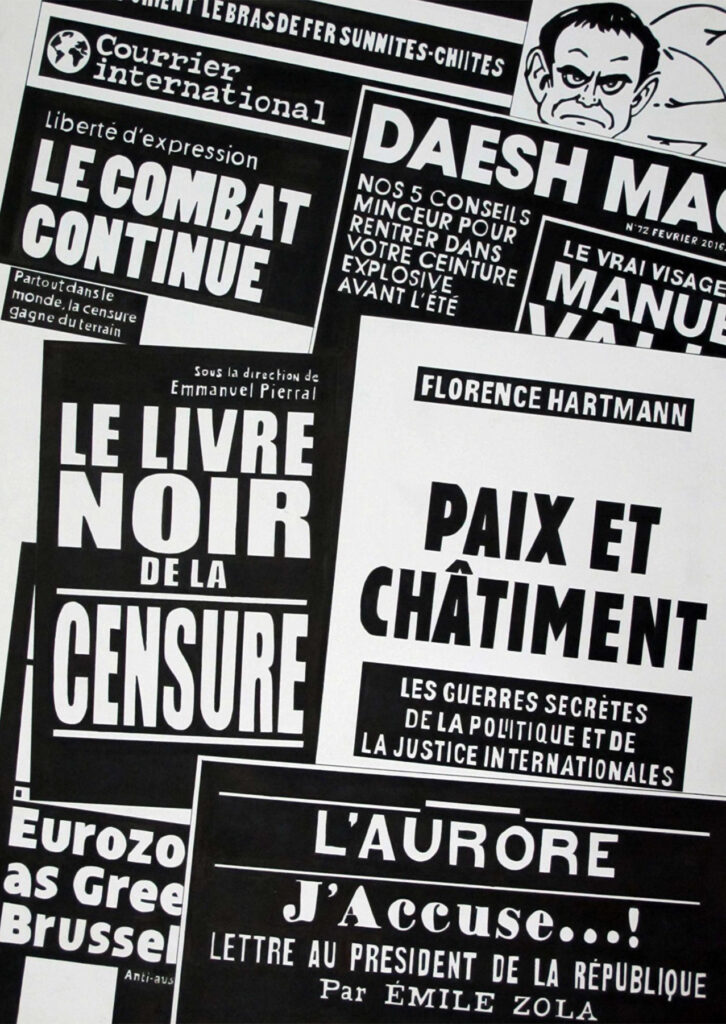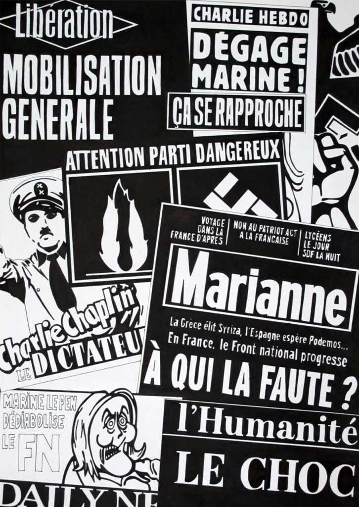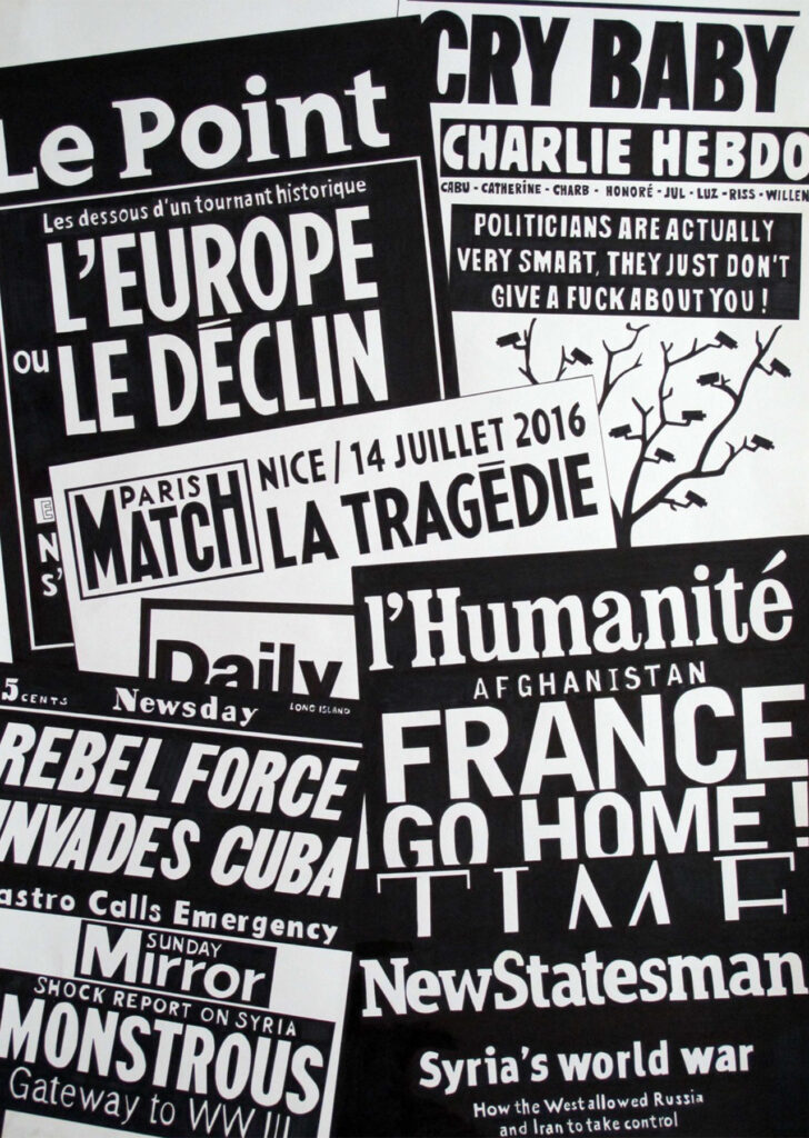 Pierre Courtin’s drawings are made of different newspapers’ headlines, books’ covers, advertisements, posters, and so on. The artist’s practice is a visual echo to the continuous stream of everyday news and its final outcome constitutes a big composition resembling a personal press clipping with the most important news and hot topics dealing with politics and society. World tragic events and human tragedies are recorded, from WWI up until Trump’s election, often mixing news from the past with present-day news; this stratagem results very effective in underlining the absurdity of events happening over and over again in history. The drawings represent the artist’s personal reflection about the times in which we are living, particularly insisting on themes such as the return on nationalism in Europe, capitalism and consumerism, racism and religion, in general ‘the craziness of our time’. They will to question our close ‘relation-ship’ or addiction to mass media, representing at the same time the artist’s meditative reaction to everyday violence as it portraited on daily news. As Courtin explained ‘When I say « meditative » it means that in this crazy world I am finding time to draw and to relax myself, those drawings are very long to do, when I draw these sentences and images become abstract; it is a sort of personal way to exorcise the brutality of our today world’.