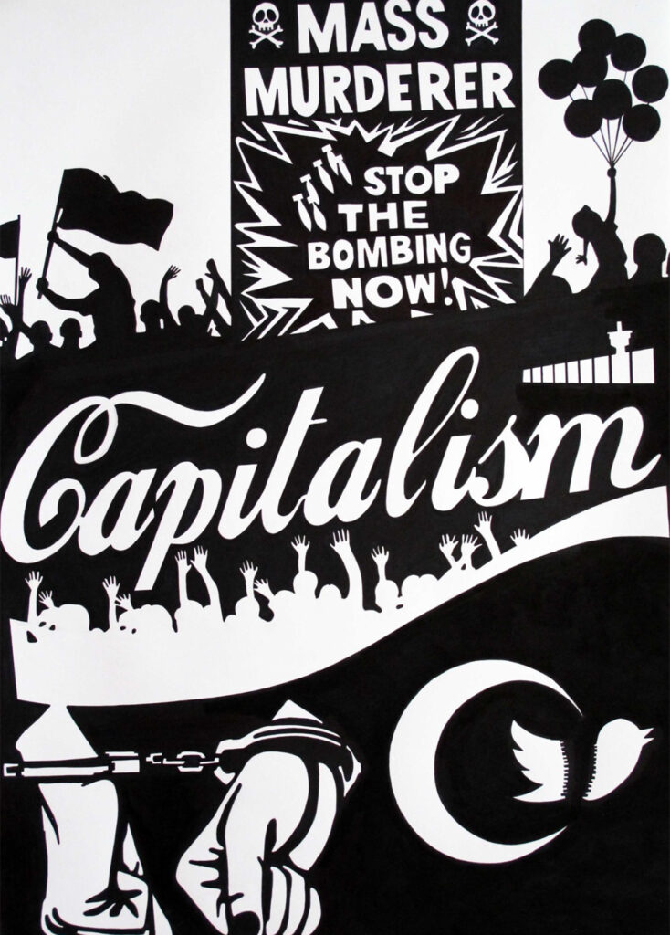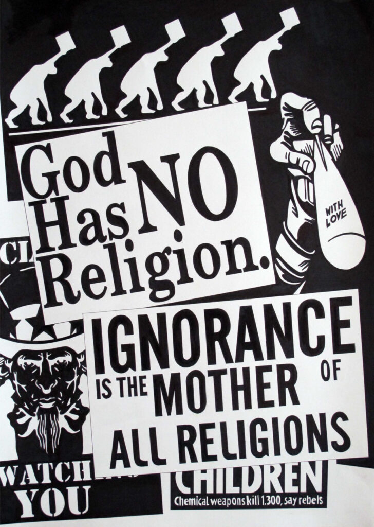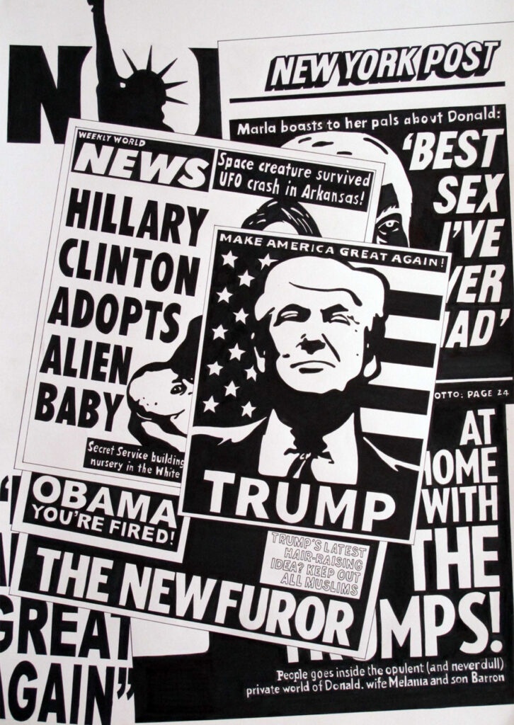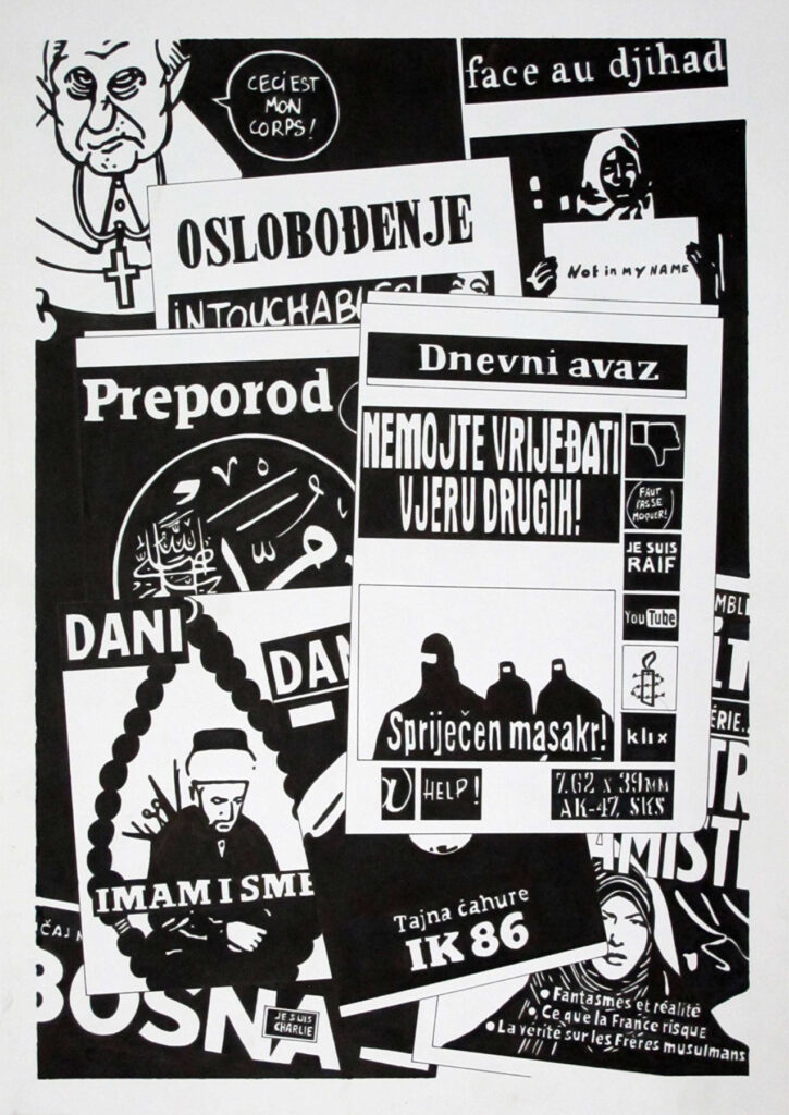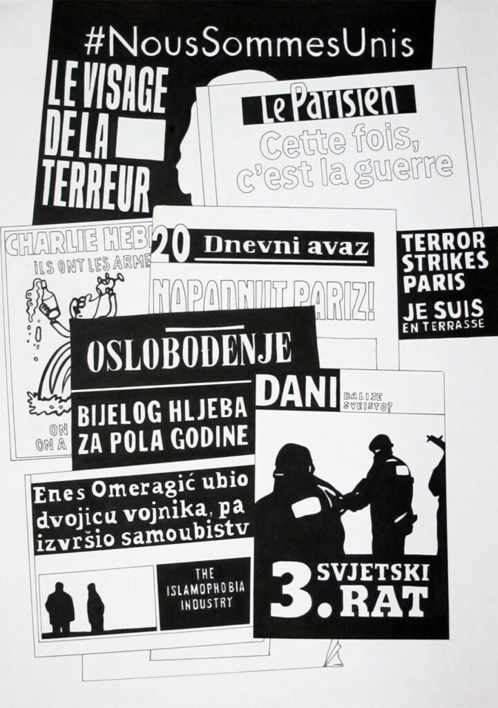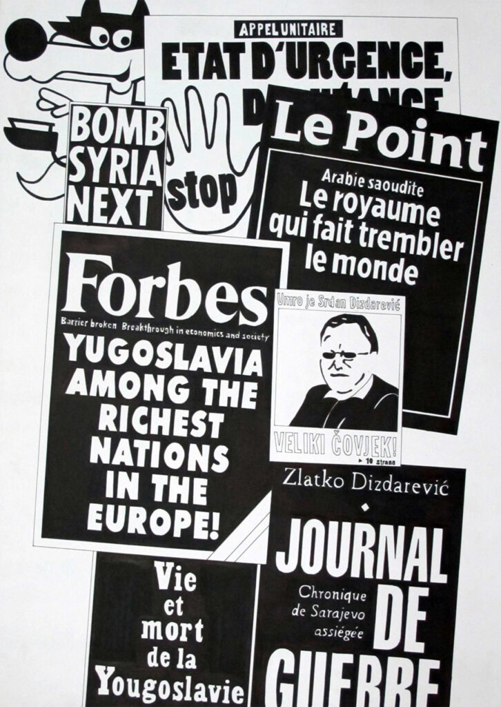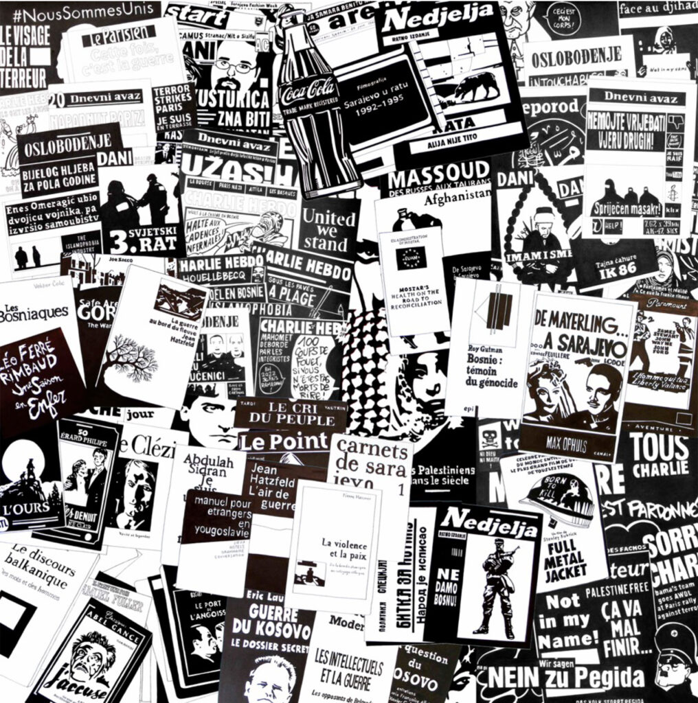 Pierre Courtin’s drawings are made of different newspapers’ headlines, books’ covers, advertisements, posters, and so on. The artist’s practice is a visual echo to the continuous stream of everyday news and its final outcome constitutes a big composition resembling a personal press clipping with the most important news and hot topics dealing with politics and society. World tragic events and human tragedies are recorded, from WWI up until Trump’s election, often mixing news from the past with present-day news; this stratagem results very effective in underlining the absurdity of events happening over and over again in history. The drawings represent the artist’s personal reflection about the times in which we are living, particularly insisting on themes such as the return on nationalism in Europe, capitalism and consumerism, racism and religion, in general ‘the craziness of our time’. They will to question our close ‘relation-ship’ or addiction to mass media, representing at the same time the artist’s meditative reaction to everyday violence as it portraited on daily news. As Courtin explained ‘When I say « meditative » it means that in this crazy world I am finding time to draw and to relax myself, those drawings are very long to do, when I draw these sentences and images become abstract; it is a sort of personal way to exorcise the brutality of our today world’.