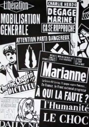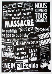 Since more than ten years Pierre Courtin has been working on two different series on drawings in a ‘non-stop’ process. The first series started in 2004 and it counts 150 drawings (black marker on paper, 40x50cm) as of today. The second series (black marker on paper, 70x50cm) was initiated the day after the ferocious assassination of the Charlie Hebdo cartoonists in January 2015 and it now comprehends 20 drawings.