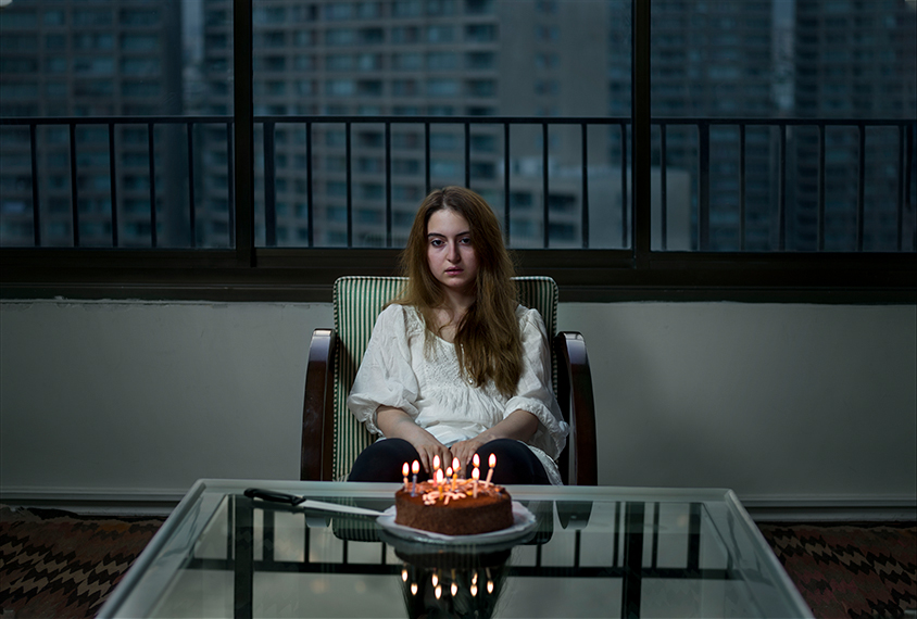 The project was my desire to look deeply into the lives of those around me who I have known for over ten years and who live in my building. I wanted to bring to life the story of a nation of middle-class youths battling with themselves, their isolated conformed society, their lack of hope for the future, and their individual stories. Over six months at 8 pm I fixed my camera on a tripod in front of the window where I had watched the same view of the city for ten years. I have tried to capture a moment of each of their stories within the frame of a window that looks out onto the cold concrete buildings that surround us daily.