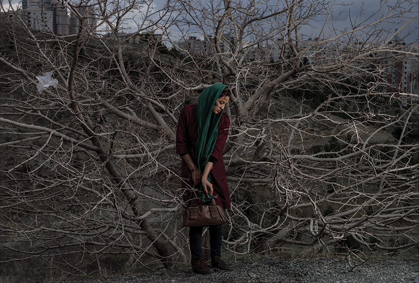 The Somayeh photo belongs to a series memorializing Tavakolian’s peers, a cohort born in the shadow of the 1979 Islamic Revolution and the long Iraq War (1980–1988) and which came of age during the short-lived period of reform time (1997–2005), when surreptitious satellite TV and the internet introduced foreign notions and awakened the possibilities of being part of a wider world. Shot in Tehran, where the artist lives and works, this image concentrates on a single individual holding still while the surrounding environment. Somayeh suggests the resilience and strength of the first post-revolutionary generation while presciently alluding to today’s young Iranian women as they attempt to reshape their futures.