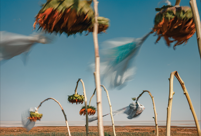 A field of sunflowers, some covered with plastic bags protecting them from the salt and dust storms that are generated in the exposed lake bed of Lake Urmia. Revered by ethnic Azeris as “the turquoise solitaire of Azerbaijan,” Lake Urmia was second only to the Caspian Sea as the largest saltwater lake in the Middle East, a haven for birds and bathers. Since the early 1970s nature and humanity have chipped away at this gem tucked in northwestern Iran, reducing its size by about 80 percent over the past 30 years.
