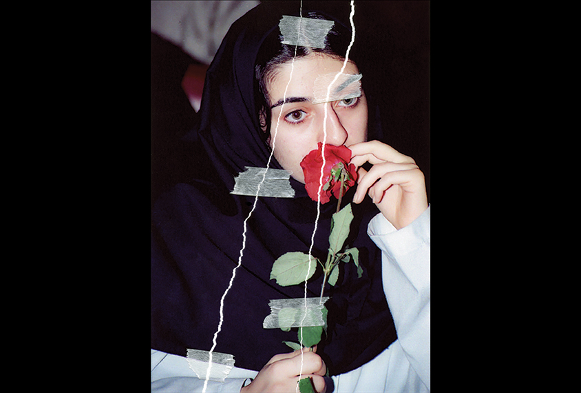 Girl smelling a rose in Tehran. The last photo of the exhibition “And They Laughed At Me” is of an adolescent girl smelling a rose. This photo is repeated throughout the exhibition but each time it is changed. What Tavakolian does to this photo, by bleaching and scratching parts of it out, destroying the rose and effacing the young woman who represents Tavakolian herself, is mercilessly violent. In a final act of demolition, she tears the photograph to pieces but then glues it back together again. This photograph was taken at the height of the reform movement in Iran at a presidential election rally. The organisers were handing roses to the young audience as a symbol of hope but that hope seems to have wilted now.